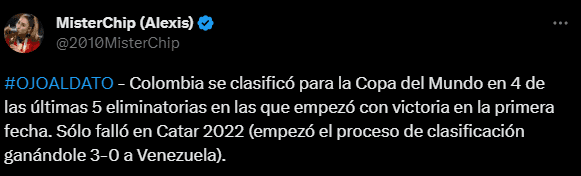 Por otra parte, hay que señalar que con estos tres primeros puntos Colombia consiguió una estadística bastante particular, la cual lo viene acompañando en los últimos años y parece un augurio importante para todos sus aficionados. Por medio de sus redes sociales, Mister Chip comentó que, con este triunfo ante Venezuela, la ‘tricolor’ repite el mismo resultado positivo que en las pasadas Eliminatorias Sudamericanas.